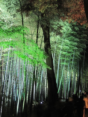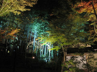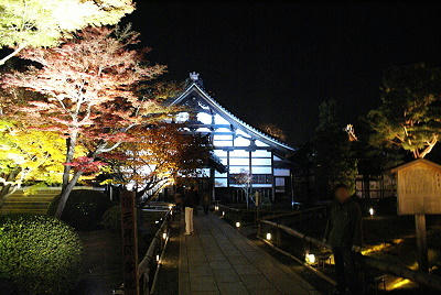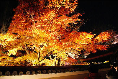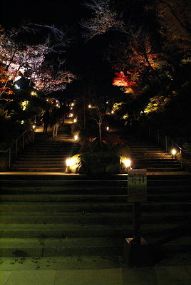 既然提了《清水寺》,因為那晚我沒帶相機的緣故,沒照片輔助乾脆一併在此敘述,相較於《高台寺》的低調沉靜,清水寺顯得高調商業許多,雖然夜楓是以燈光的投射來欣賞紅葉的另一面,不過極富盛名的清水寺輔以更多的光線來展示自身的實力,整個寺院可說是一個燈光秀的會場,直射天際的探照燈來回交錯,五顏六色的底燈將楓葉的美展現得淋漓盡致,再襯以遠方京都市區的夜景,讓人看得大呼過癮,參觀的人潮雖多,但以清水寺廣大的佔地,並不感到擁擠,只是如清水舞台這類的熱門取景點永遠有一堆人卡著就是。