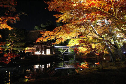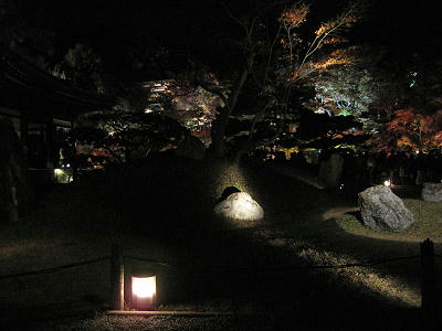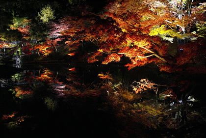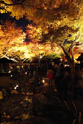 過了數秒才會意過來,這完全是如鏡面般的水池所呈現出池邊的楓紅,利用周圍打燈所造成的錯覺,堪稱是標準的「楓·光·明媚」,即使隔天衝了趟《清水寺》看夜楓,終究不若高台寺給我那般的驚喜。寺內的道路不寬,空間亦不算大,所以裡面的遊客摩肩擦踵擠得水洩不通,即使人如此多,整體仍舊感受得到高台寺庭院設計的巧思,可惜在不容許使用腳架的狀況下,清楚的照片不多,湊合著看吧。