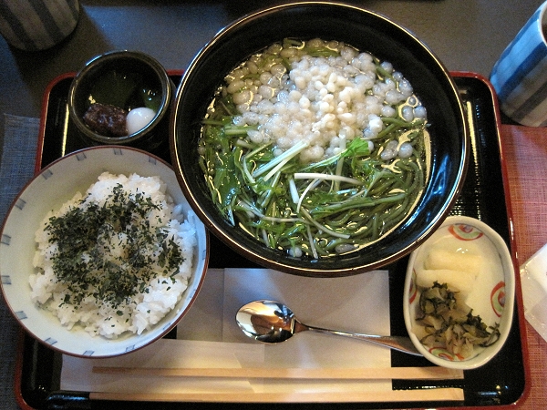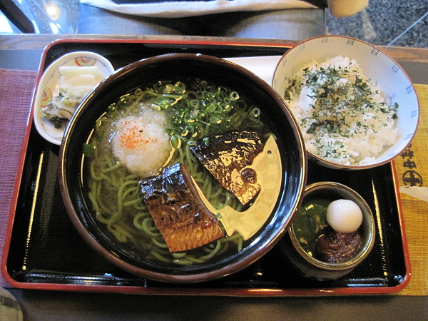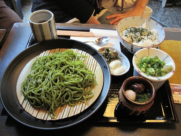 ▼ 茶蕎麦セット(抹茶蕎麥冷麵)¥1100,嗯...呃...啊...這個...跟7-11賣的涼麵吃起來差不多說...海苔飯沒味道,在《美濃吉》吃的早餐以海苔片夾飯吃可好多了,再說飯黏呼呼的糊成一團,我們沒一個把飯吃完的。