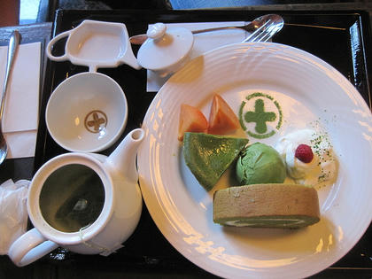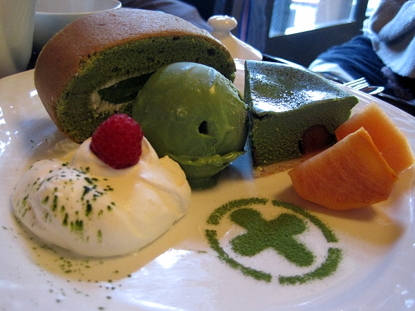 ▼ 中村藤吉プレート¥980,為中村藤吉創業150週年紀念,每日限定30份的甜點拼盤,因為霜淇淋我獨食了,這盤我有試吃到瑞士卷,還不錯,只帶些抹茶味,另外抹茶慕斯(三角)太抹茶了,個人不喜歡。整體說來每樣都很甜,但是配那壺茶倒是剛好,聽說羊羹&和菓子那~麼甜就是用來搭配正統抹茶的苦,不知是真是假?