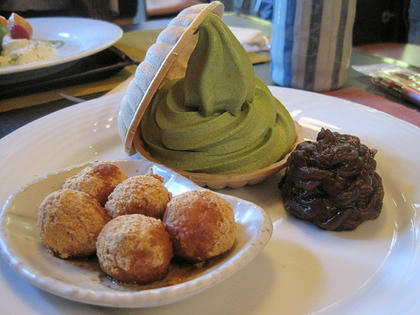 ▼ ソフトクリーム(抹茶霜淇淋)¥720,除了冰之外還搭上了"白玉"(湯圓或說麻糬)&"小豆"(紅豆),基本上抹茶冰配上紅豆就是無敵了啦!除了好吃沒啥好形容了,什麼「煮得軟爛的紅豆,刮下一小塊將之與一匙抹茶霜淇淋同時送入口中,頓時兩者氣味在舌尖上混合,卻又各自綻放,不只是入口即化,根本是與心靈融合了!」的這種鬼話我不會掰,就是「好吃」啦!至於白玉我好像沒吃,交給喜歡麻糬的女生解決了,評價還不錯。