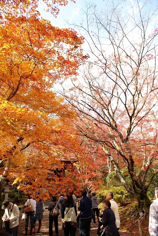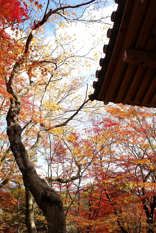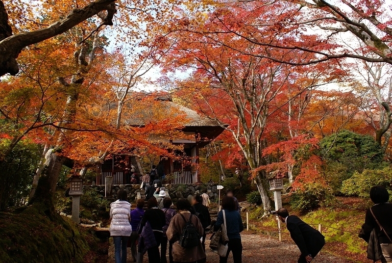 ▼ 對於初次賞楓而言,雖然路上已經看過一小部分楓紅,但這裡真是嚇壞我了,現在看著照片,卻發現遠不及當時親眼所見的震撼,相較於之後在《天龍寺》那純粹的紅,《常寂光寺》呈現在我眼前的,是遵循著紅、橙、黃、綠四色的環繞組合,「沈醉」二字最足以代表我的心境,小猴和我都同意,在這兒設個發呆亭,是真的可以讓遊客醉倒在亭裡的。